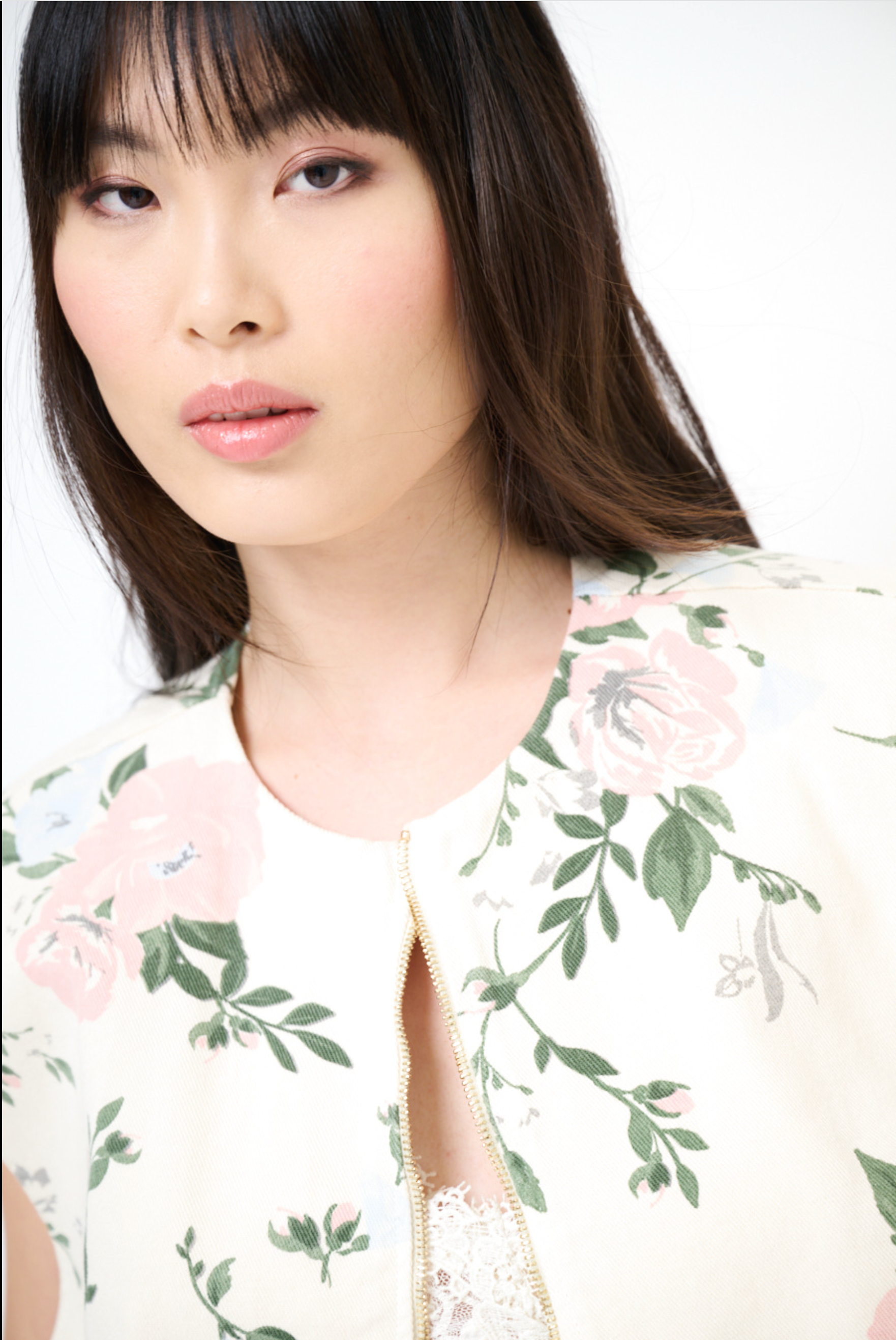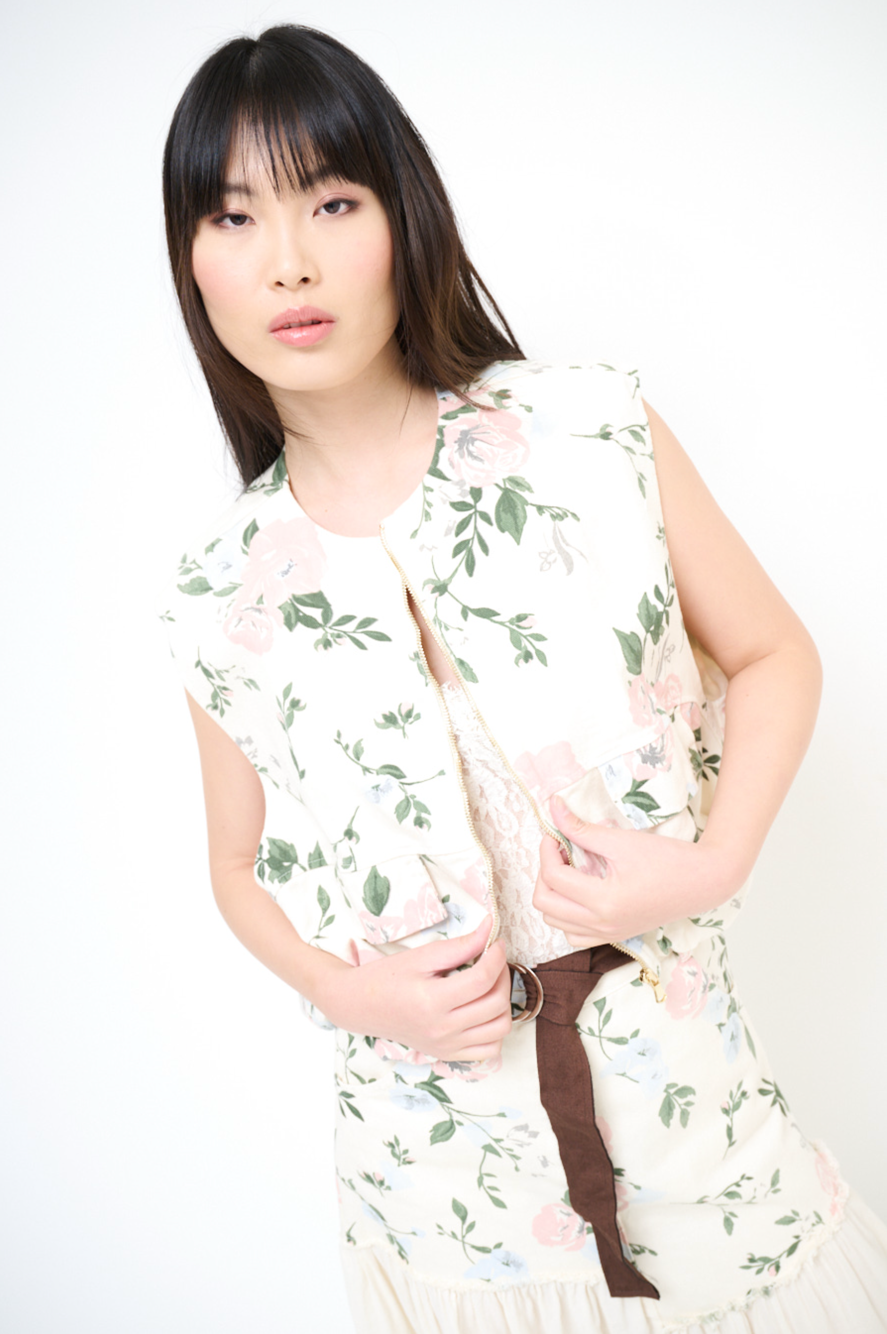 Gilet van gabardine met bloemenprint, ritssluiting aan de voorkant, langer aan de achterkant en met binnenvoering.