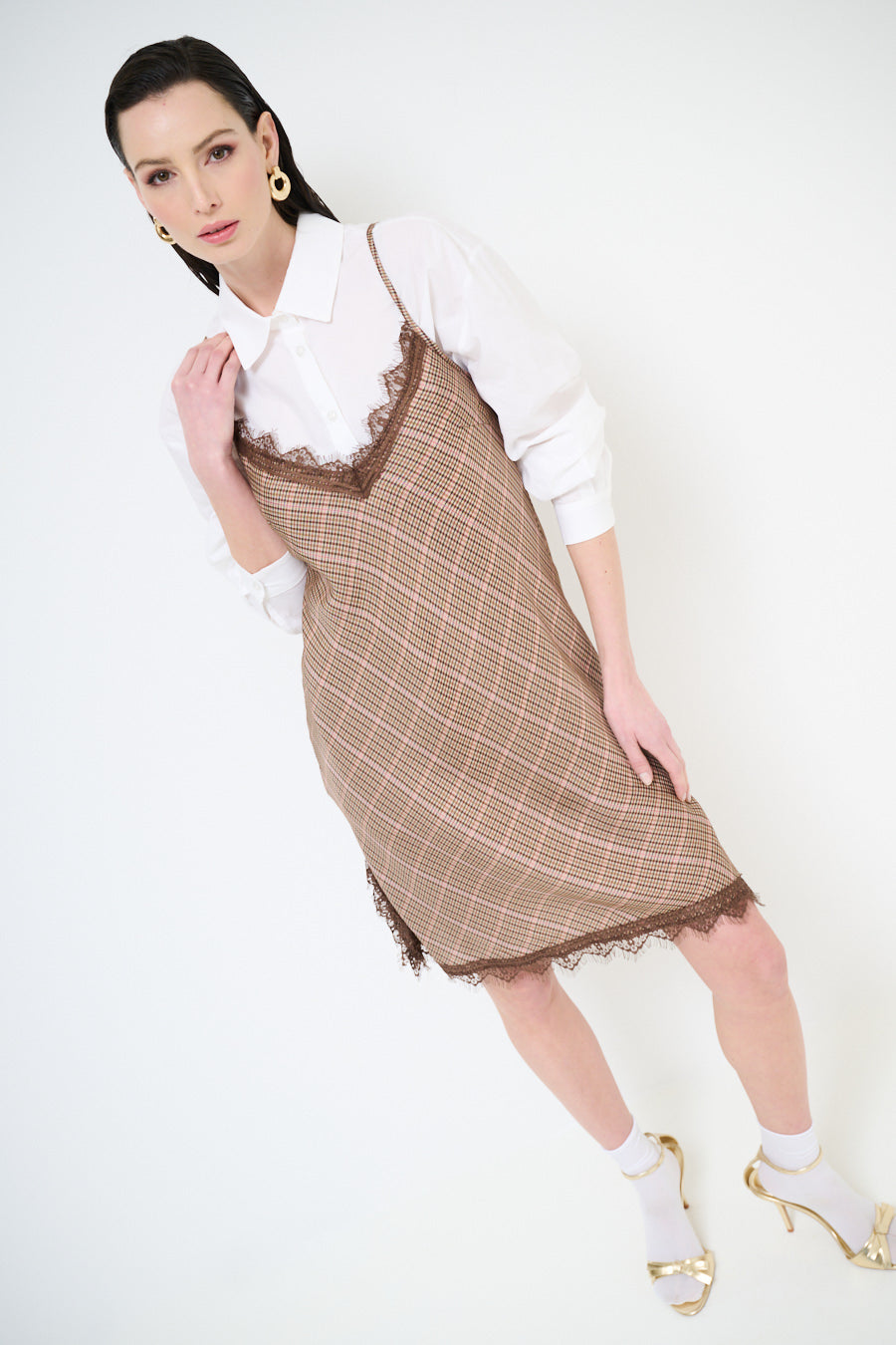 Midi-jurk met ruitpatroon, dunne bandjes en kanten inzetstukken aan de zoom en halslijn