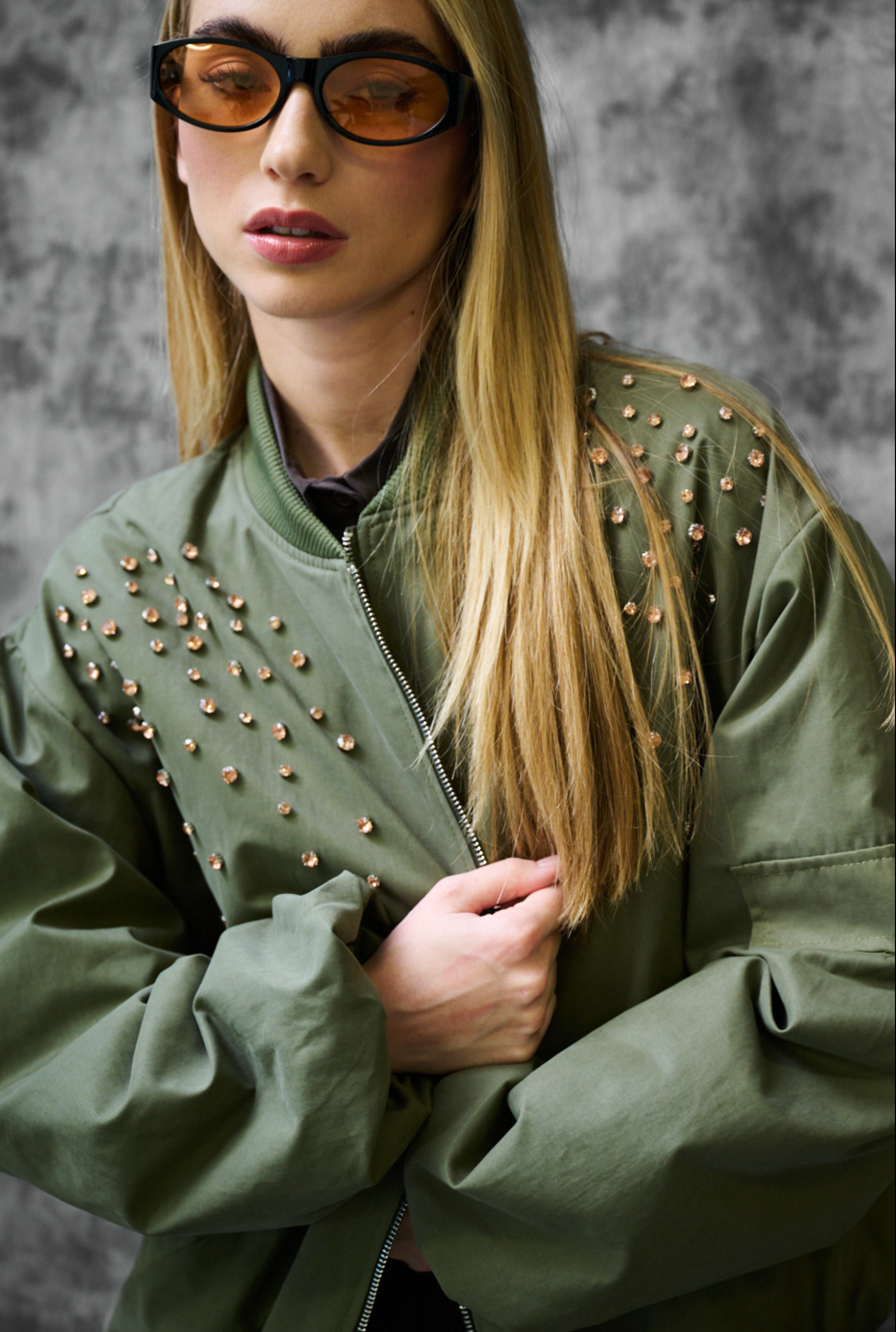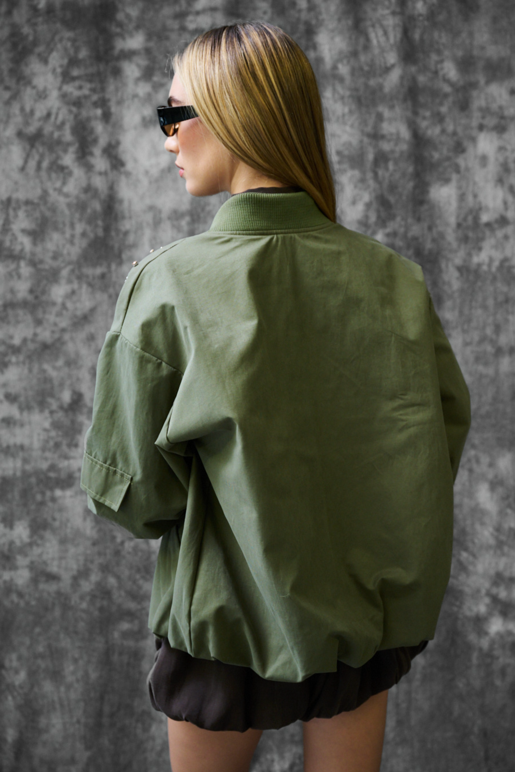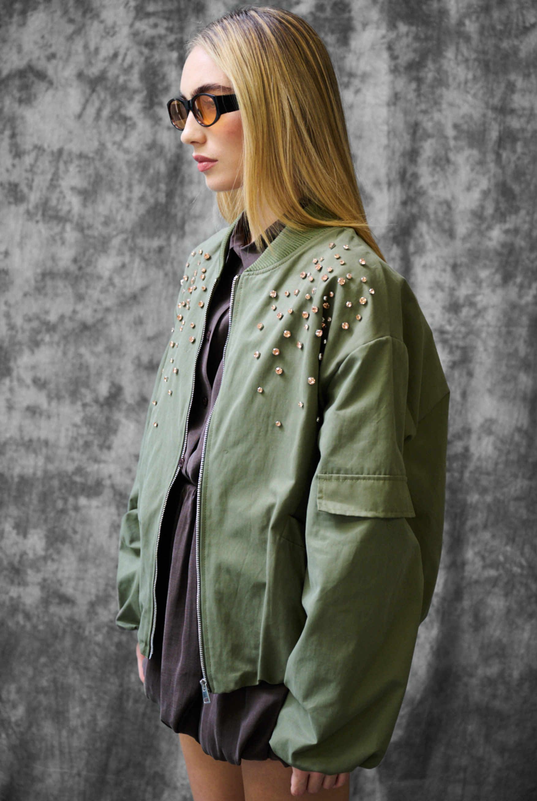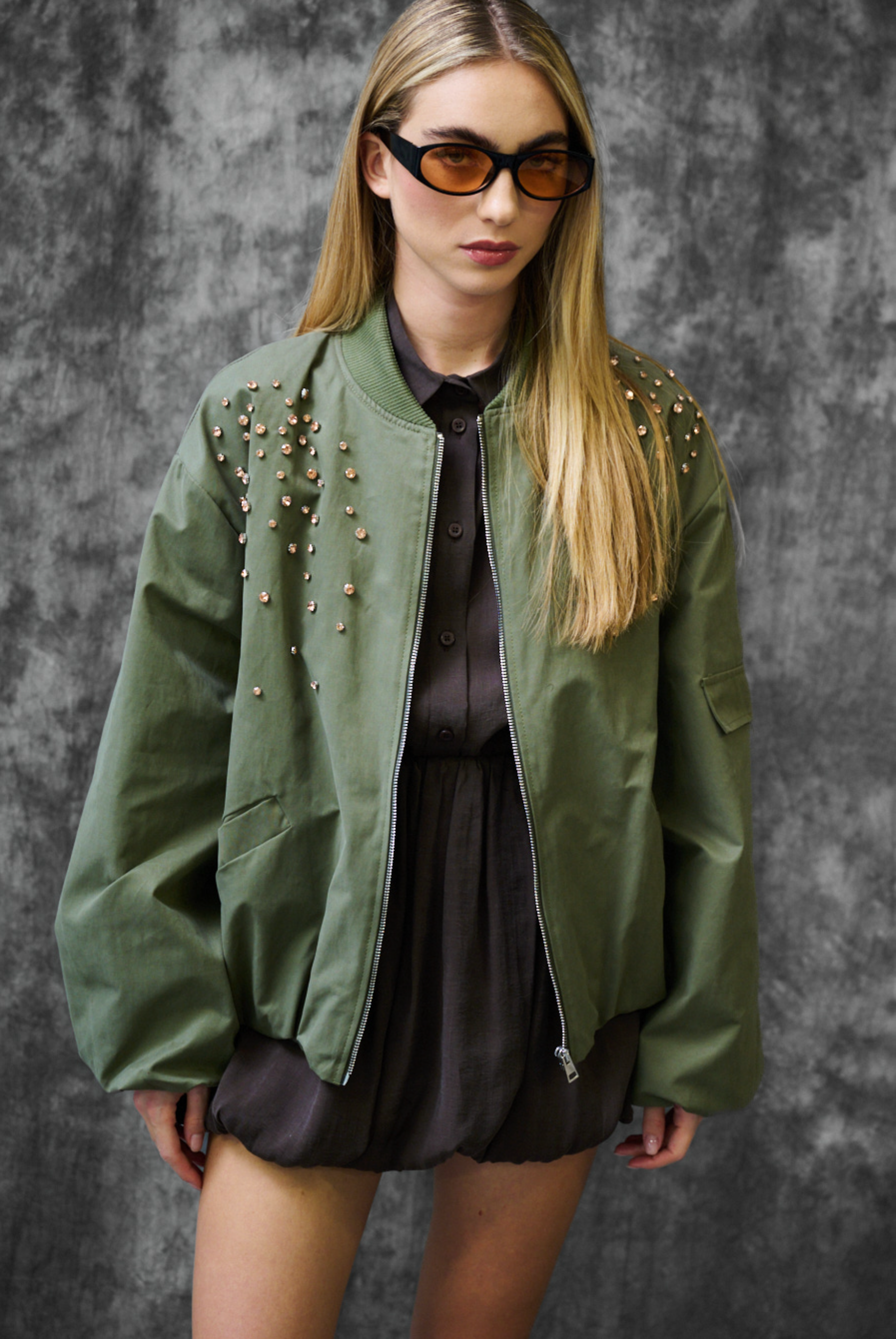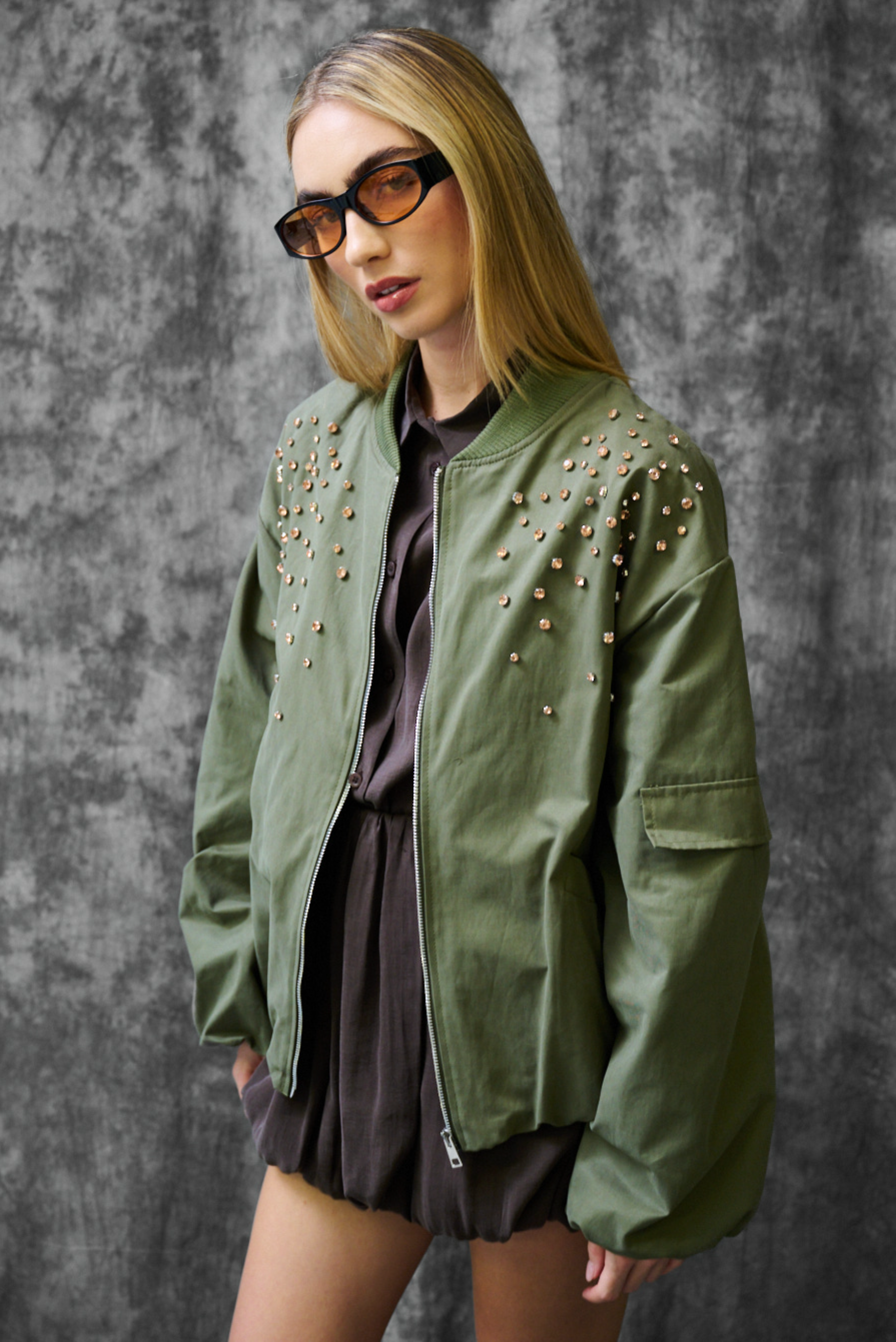 Korte bomberjas met grote schuine zakken, ritssluiting aan de voorkant en sierknopen op de schouders, met binnenvoering.